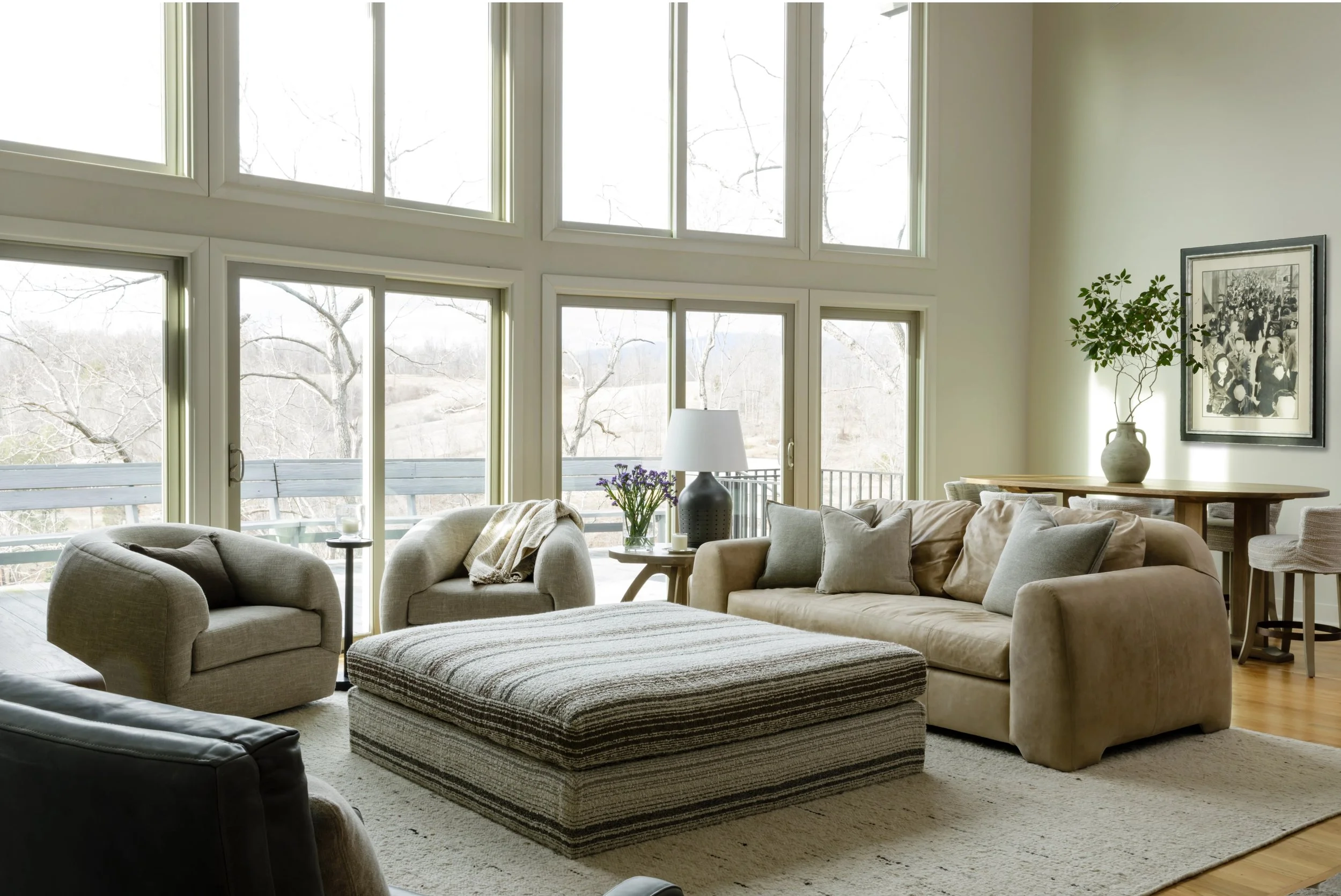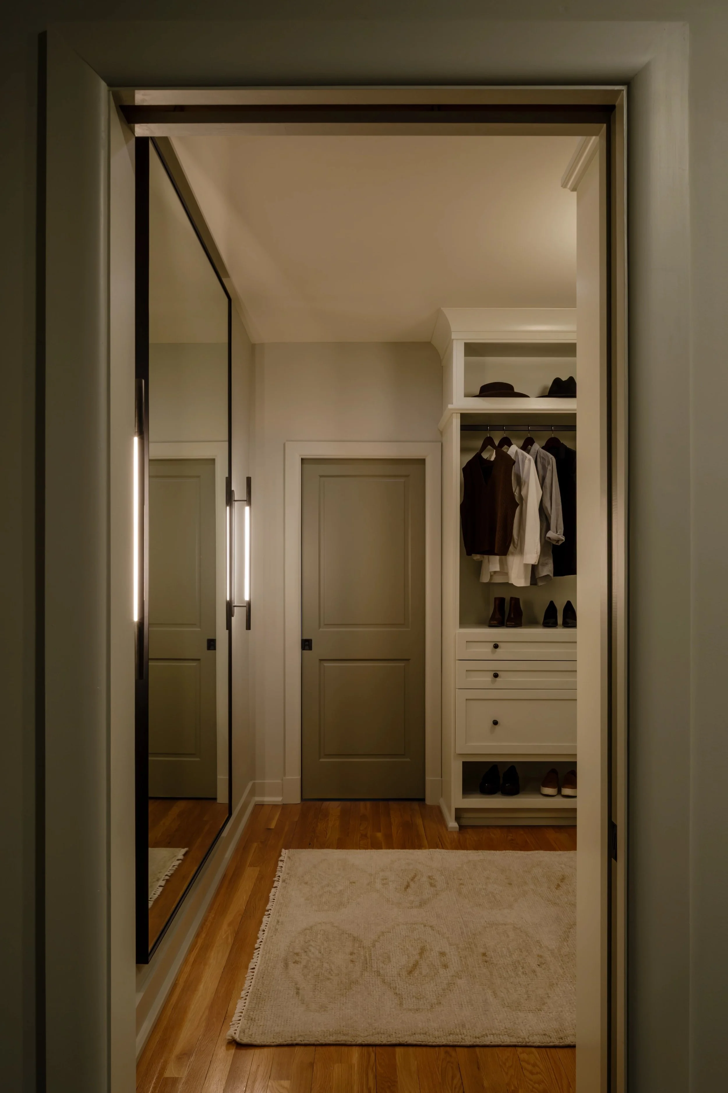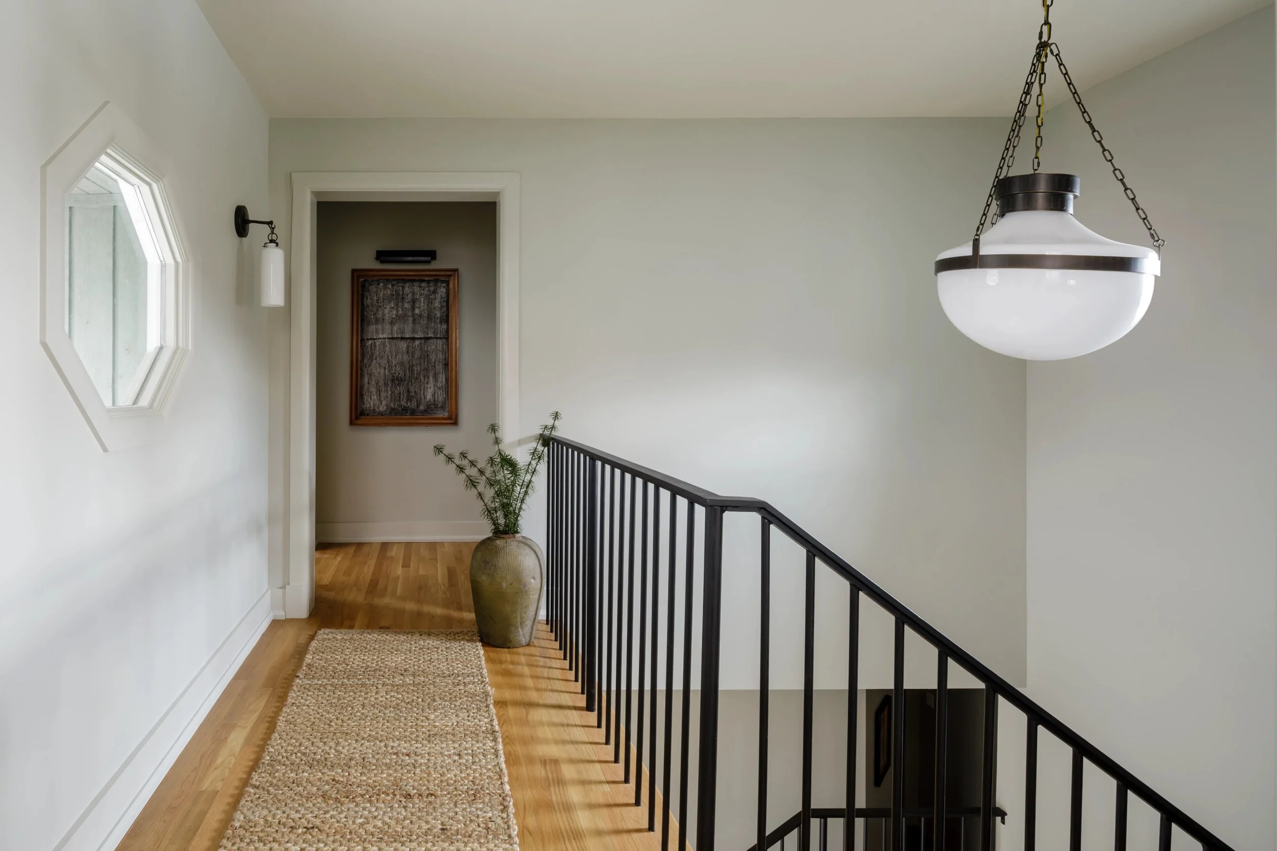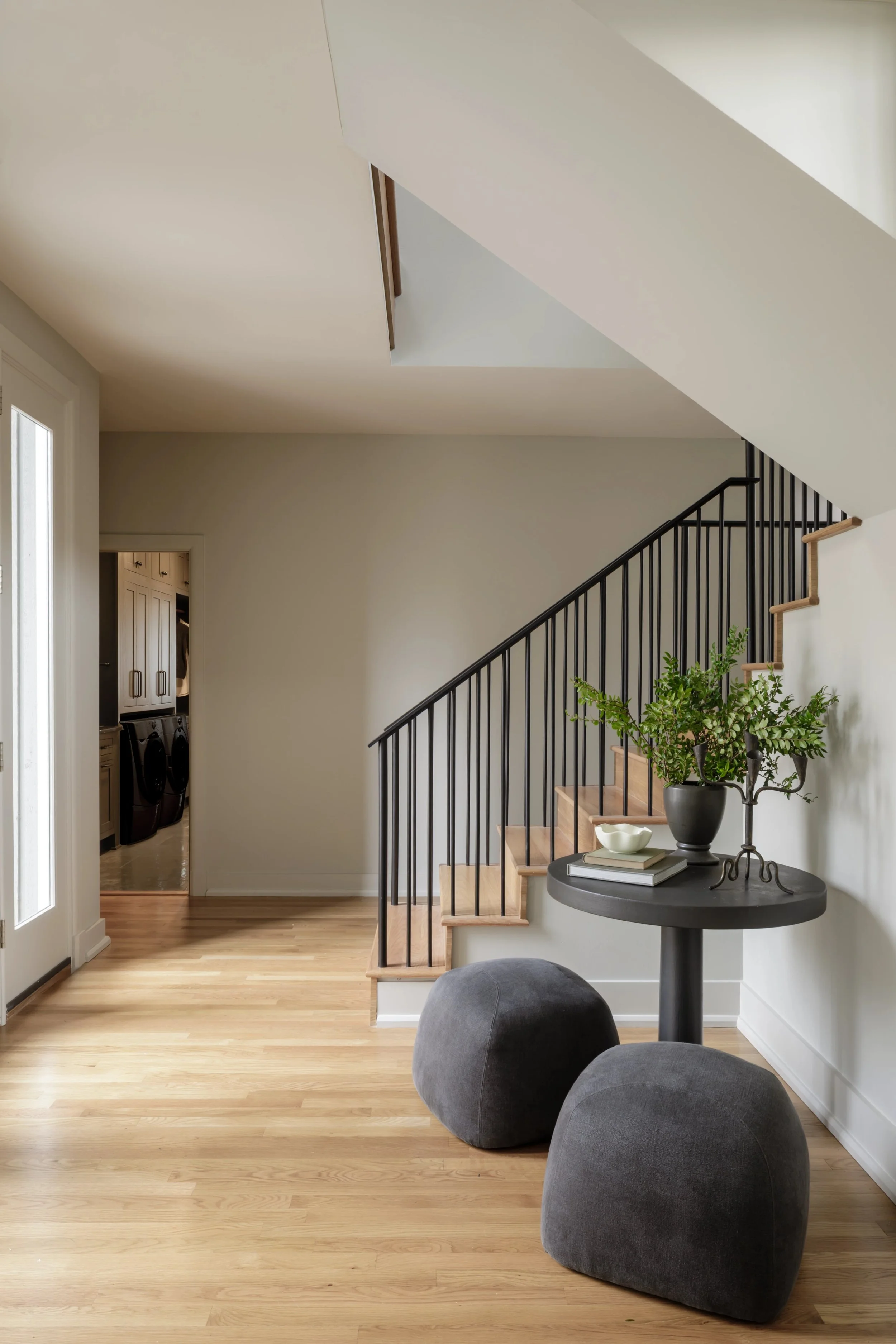 What began as a consultation for a new stair evolved into a full-scale renovation touching nearly every room and redefining how the home is experienced. Originally constructed in phases, the home relied on a spiral staircase as its sole connection between levels. Through a careful study of the existing plan, we uncovered underutilized space on both floors, allowing for the design of a new stair that not only improves circulation but anchors the home architecturally. The reimagined foyer, once terminating at a blank wall, now unfolds into a moment of arrival that feels intentional, open, and inviting. Beyond the stair, the renovation introduces a series of thoughtful spatial shifts. The primary suite was completely reworked, with both the closet and laundry room relocated to better support daily routines, while an additional office was seamlessly integrated into the plan. Overlooking the James River, the home serves as a quiet respite from city life.